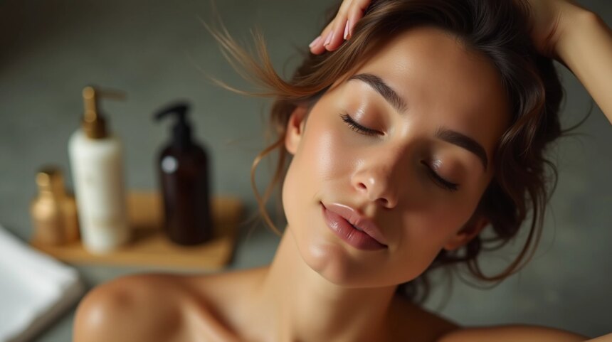 Femme appliquant un shampoing naturel dans un salle de bain moderne